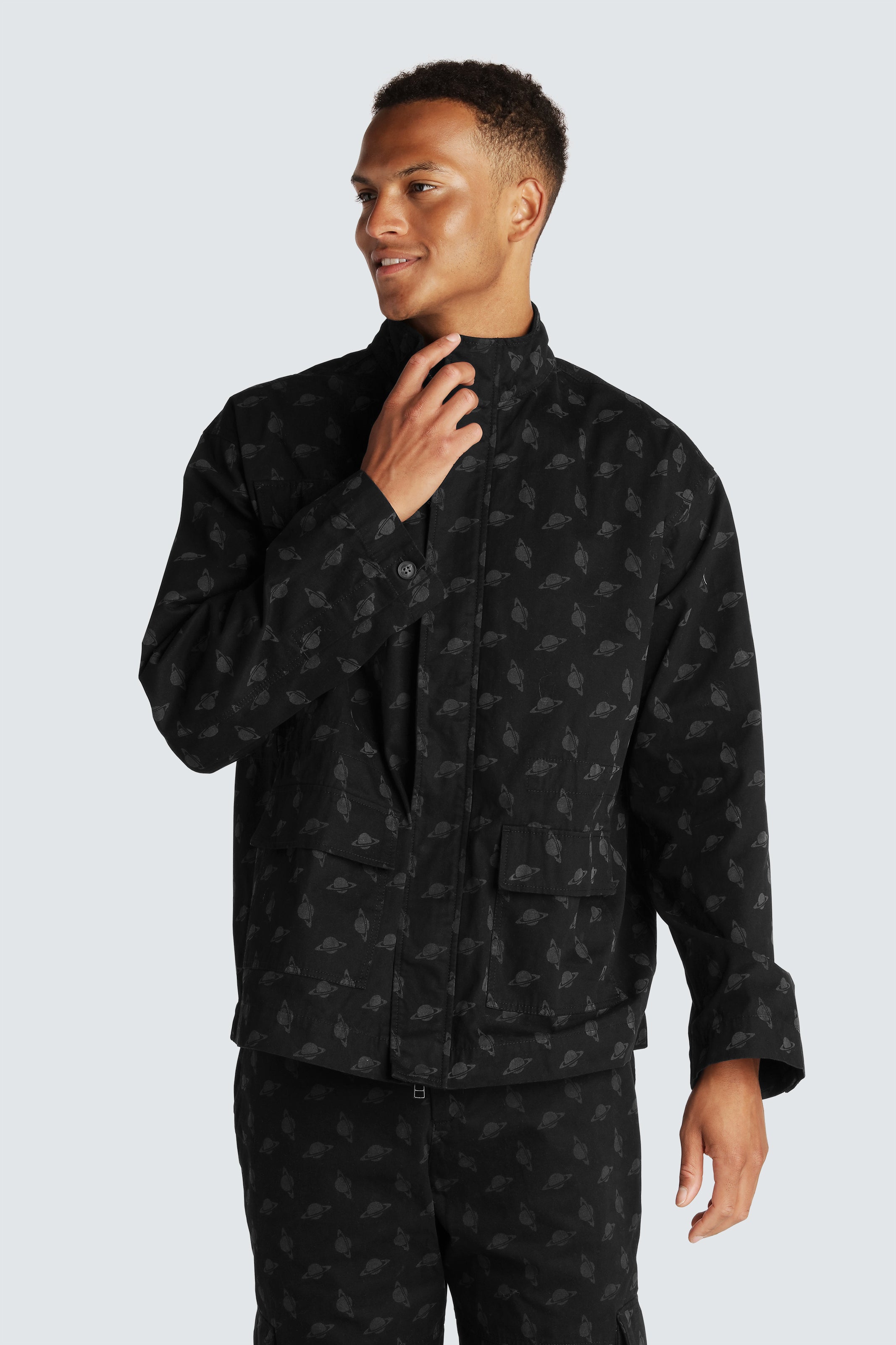 Cargo1 Zip Jacket i sort med laserprintede planeter.