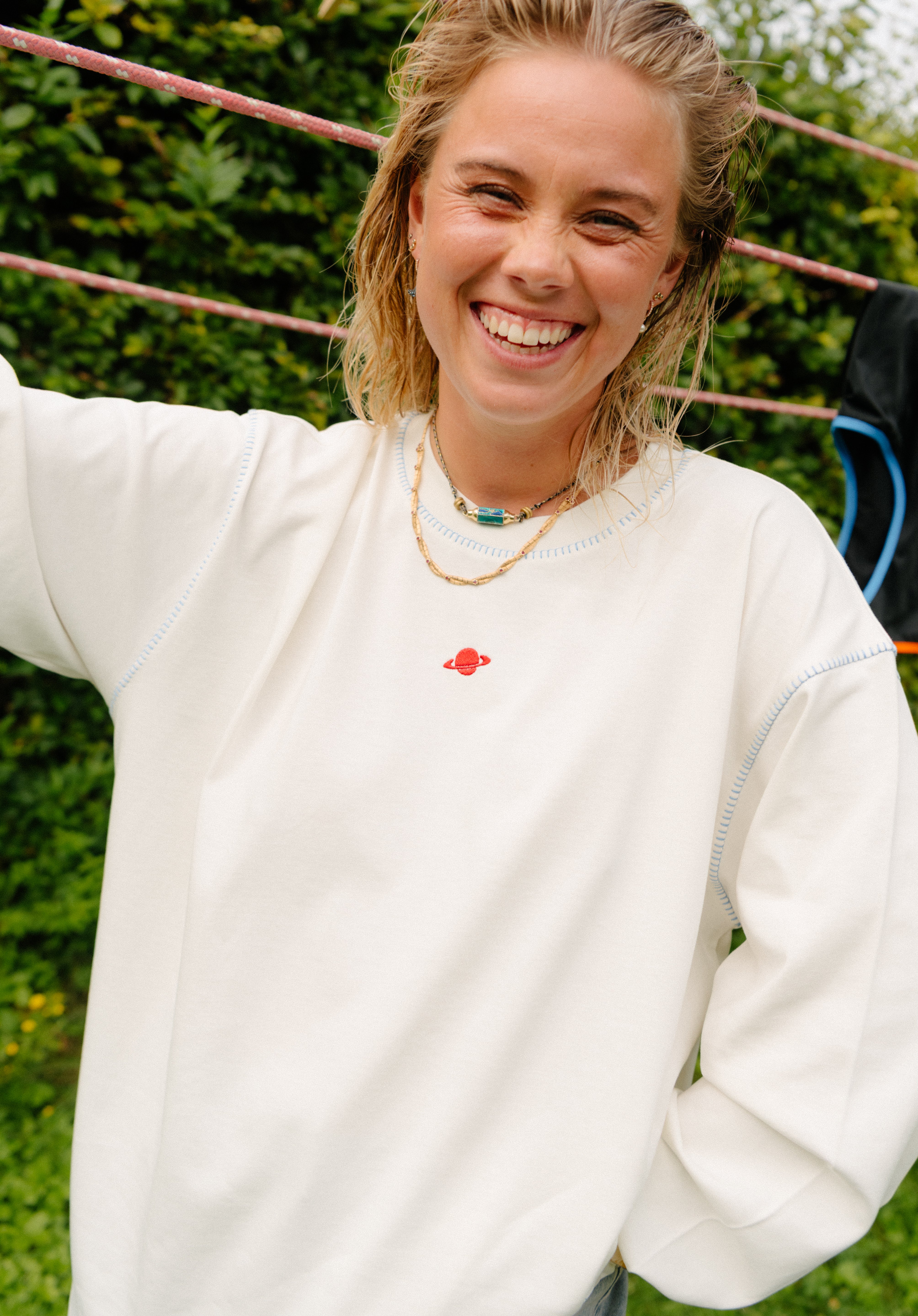 - "Off-white" med lyseblå syninger og et lille rødt planetbroderi.