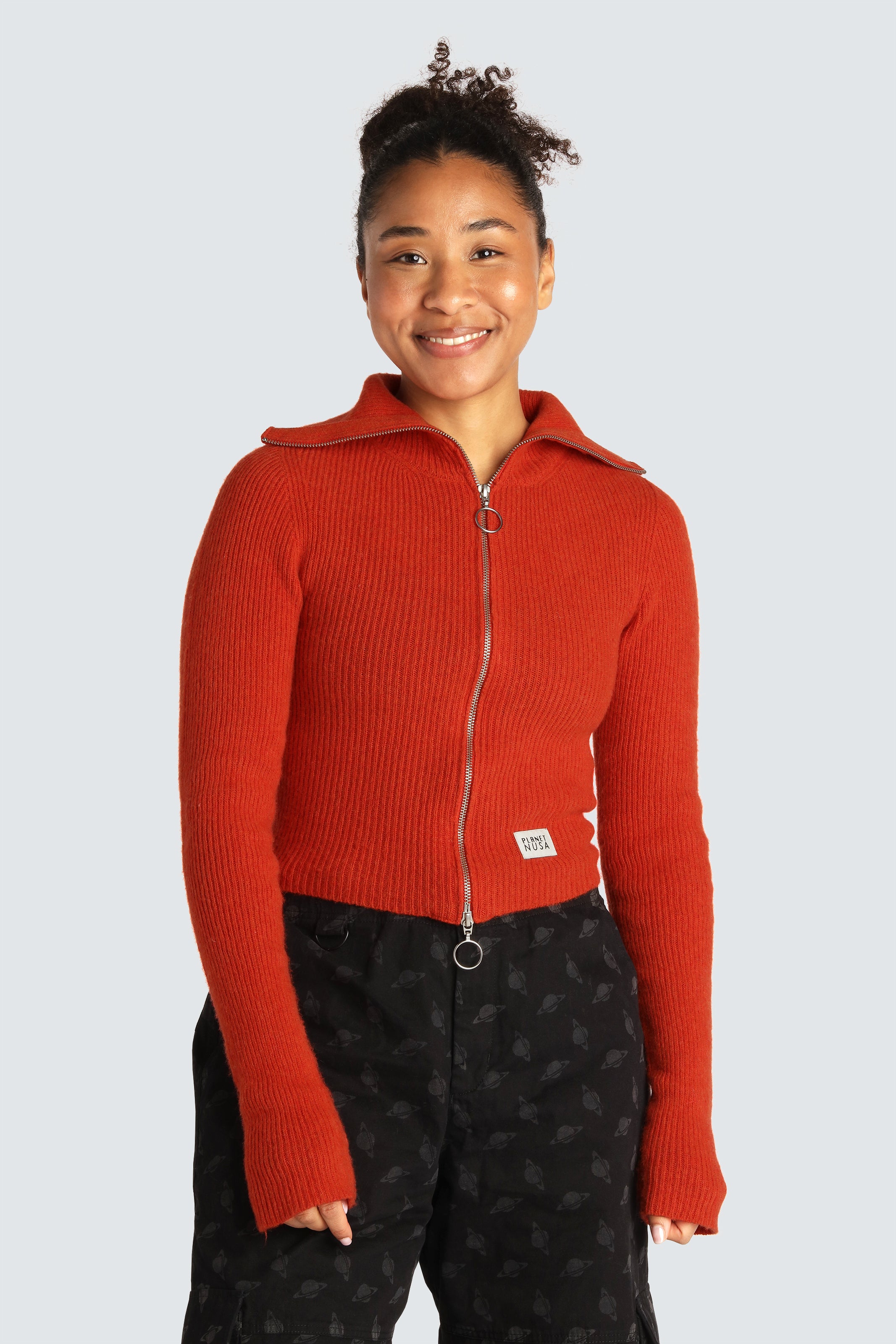 - Ribstrikket design i brændt orange farve, der giver et markant og hyggeligt look.