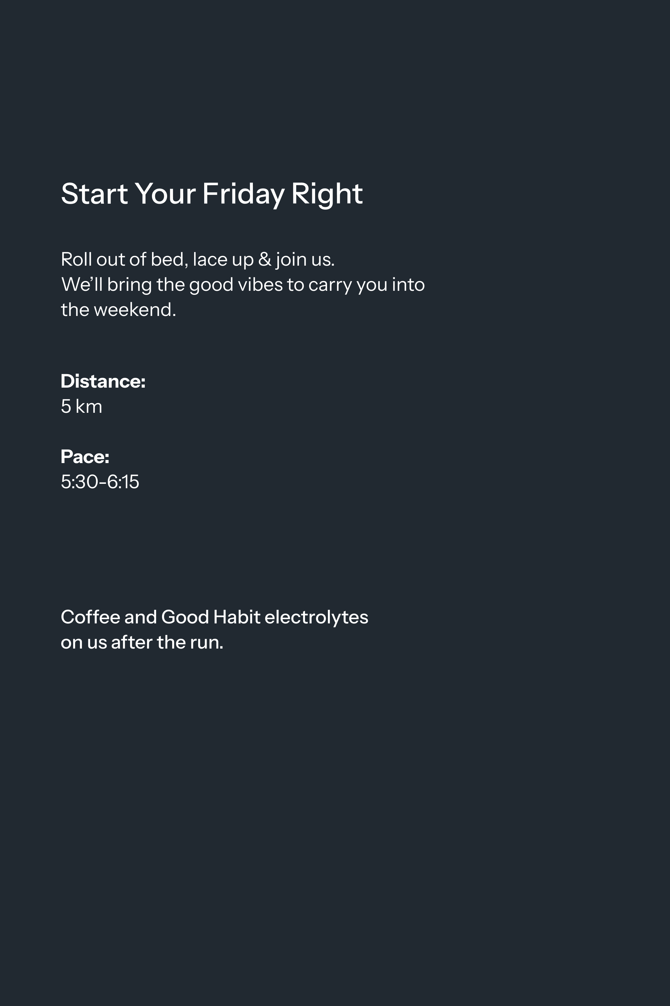 Roll out of bed, lace up & join us. We’ll bring the good vibes to carry you into the weekend. Weather can’t stop us, but maybe bring a layer if it’s acting up.