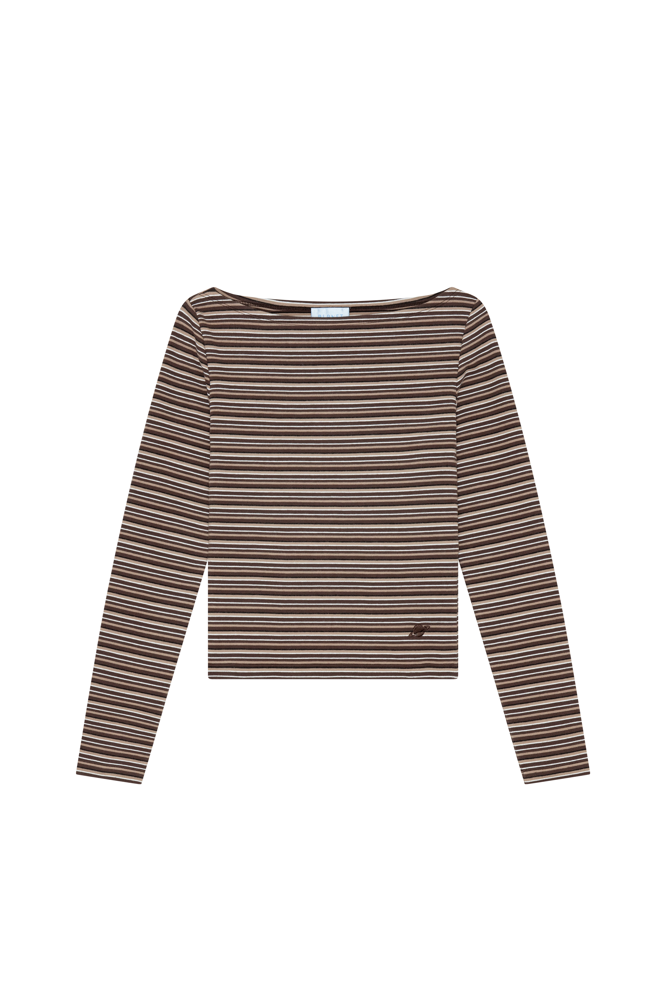 Lavet af chokoladebrun, hvid og blå stribet jersey.