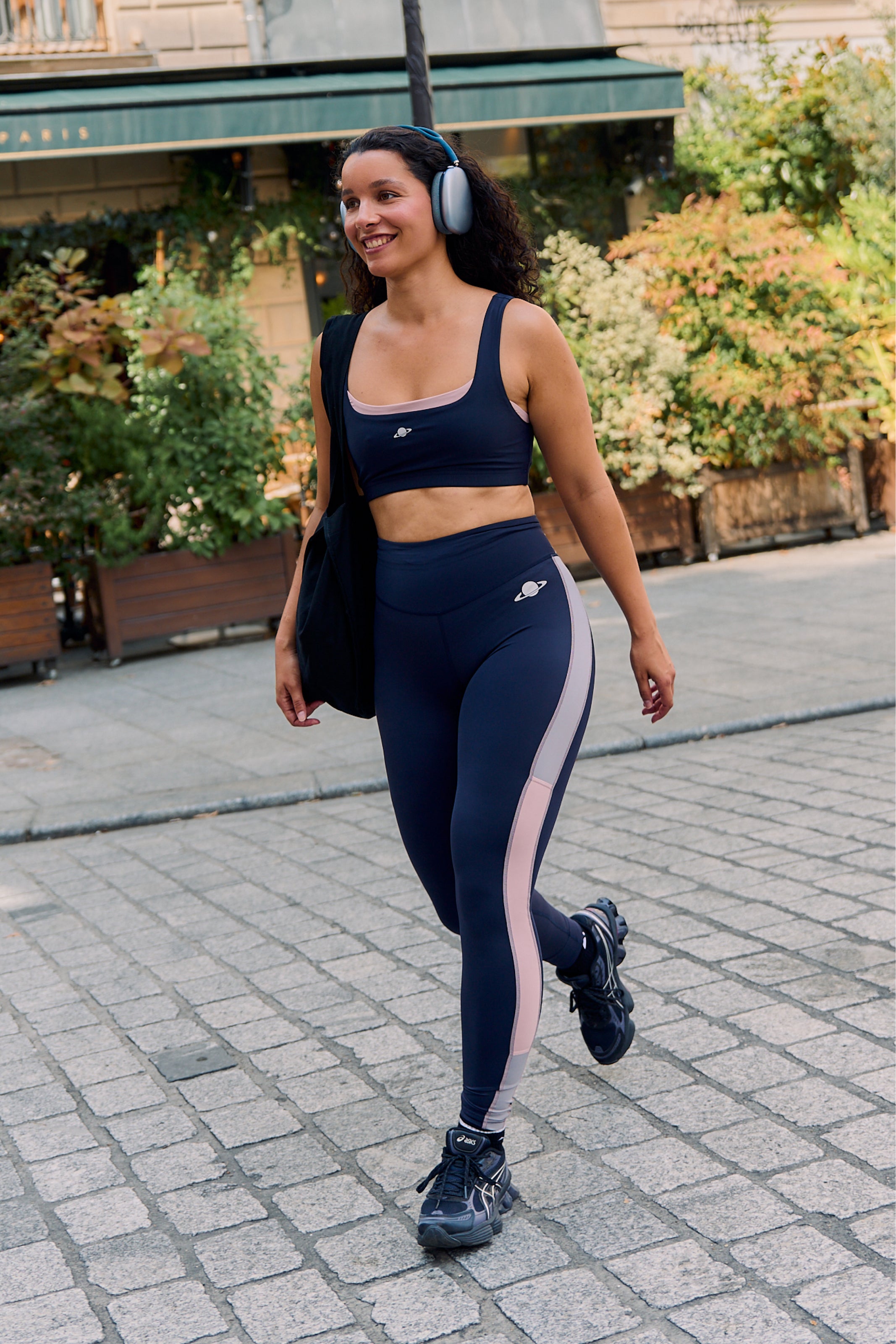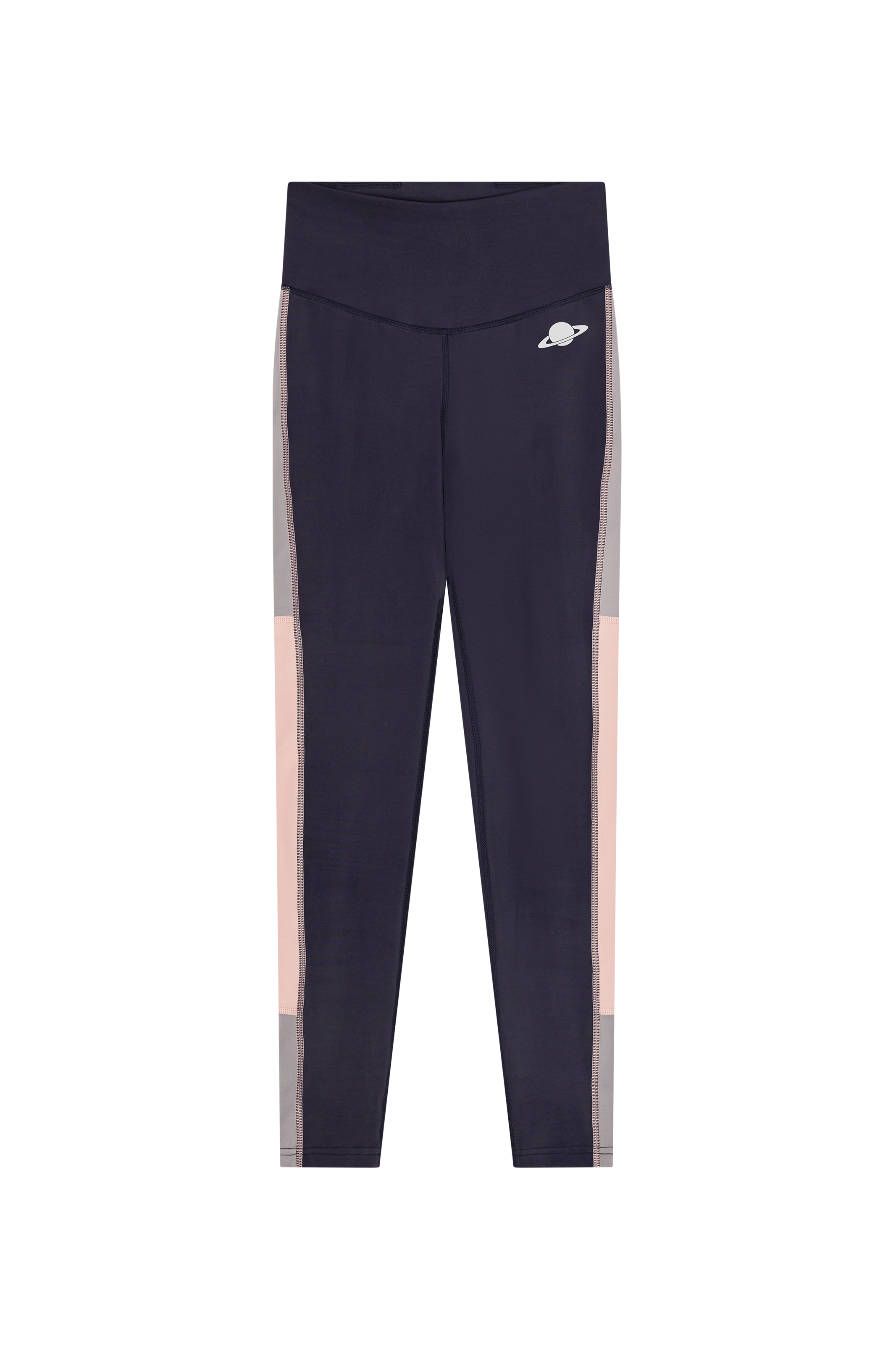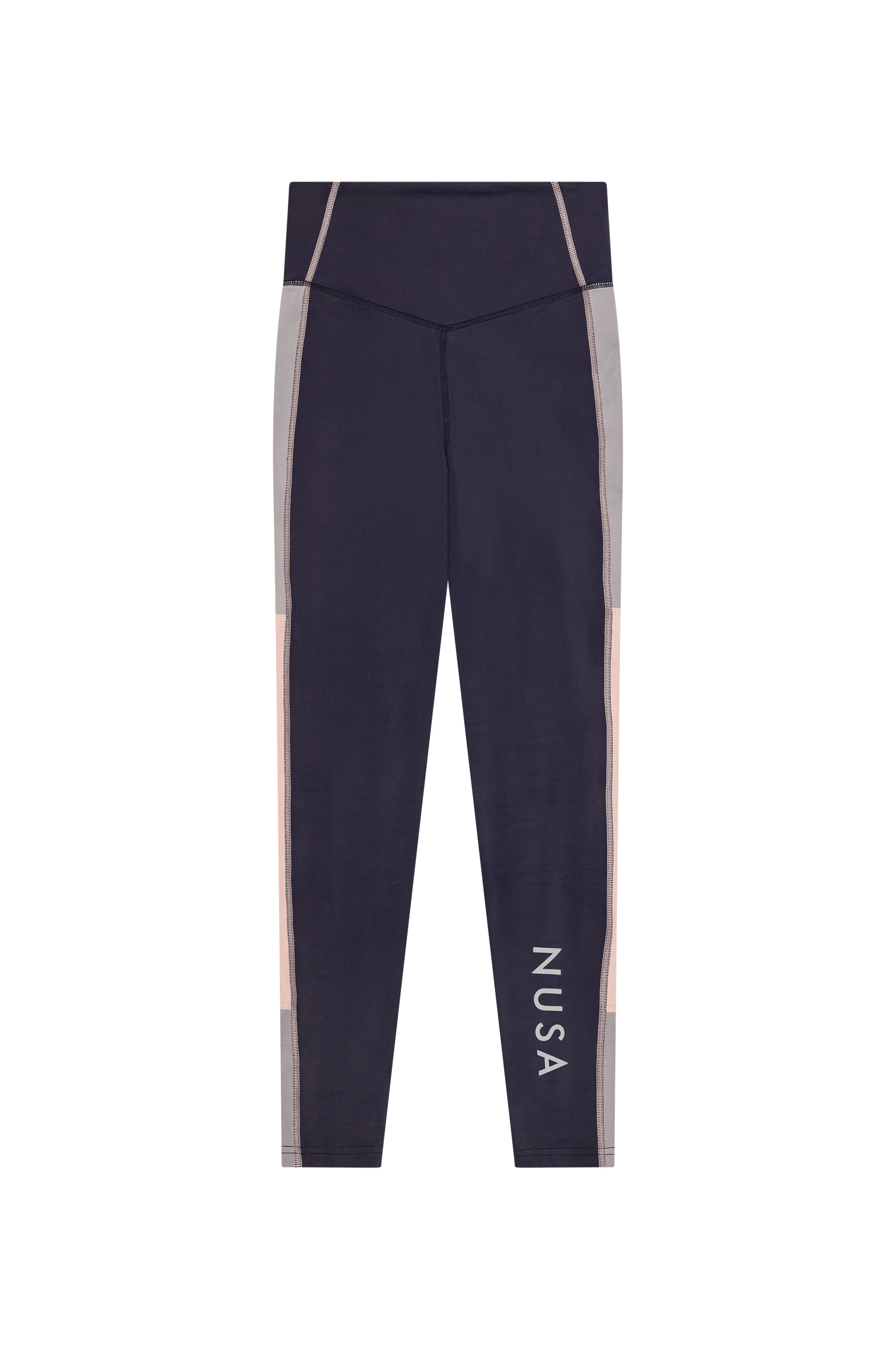 - Farveblokkede tights i navy med sidepaneler i grå og rosa.