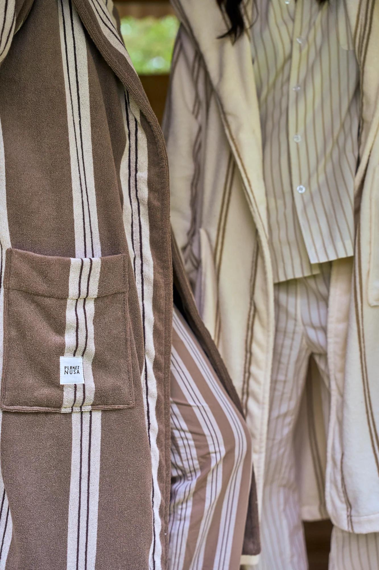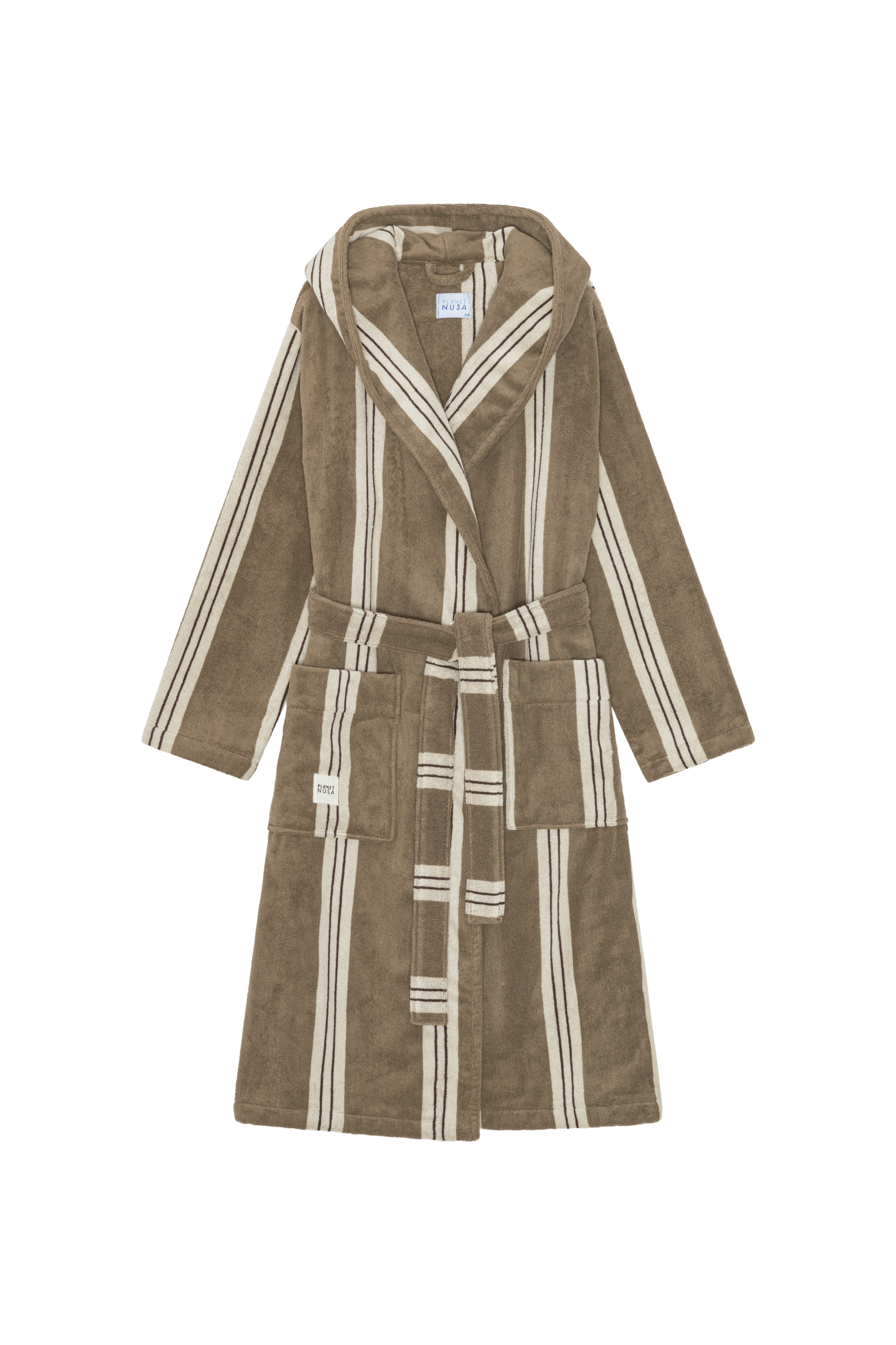 Wrap yourself in soft serenity. Made for slow mornings and spa-day moods, Bathrobe1 is your new go-to for cozy comfort. Crafted in soft, striped terry cotton with a roomy hood, tie belt, and deep pockets, plus a woven Nusa label for that finishing touch.