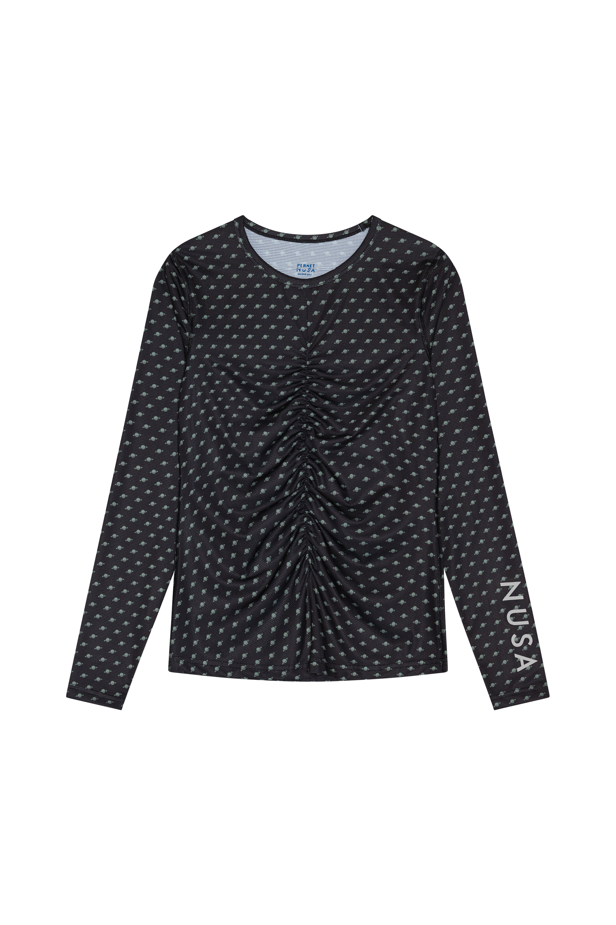 Sleek and shiny long sleeve in black with small army planets all over 🪐🪐