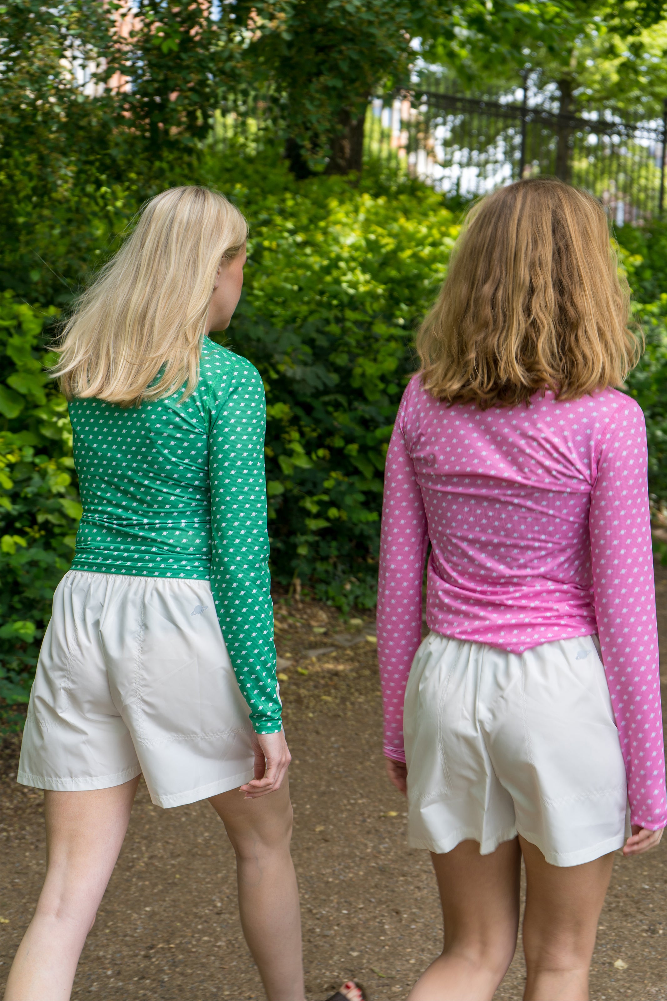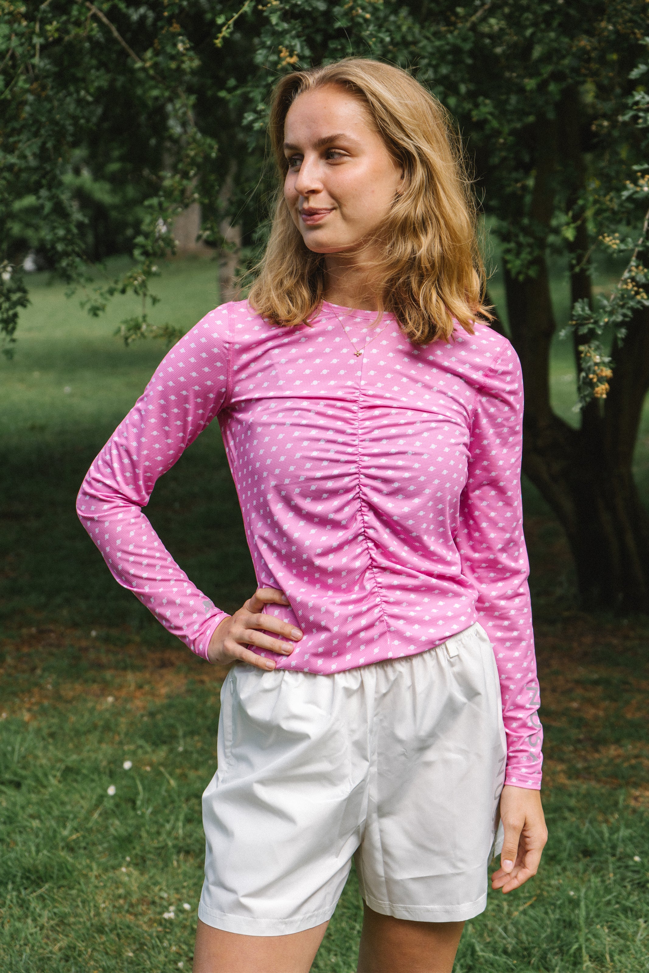 Sleek and shiny long sleeve in bubblegum pink with small white planets all over 🪐🪐