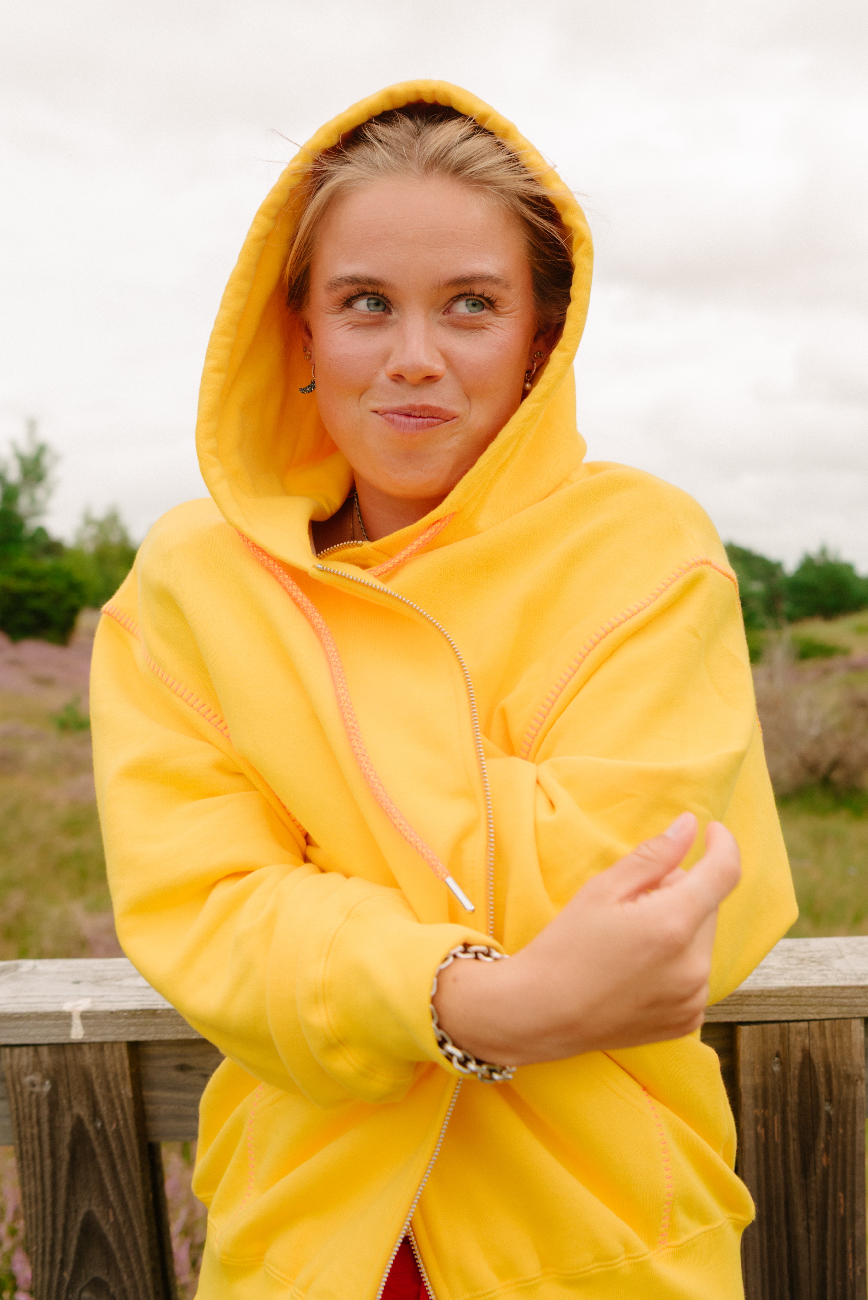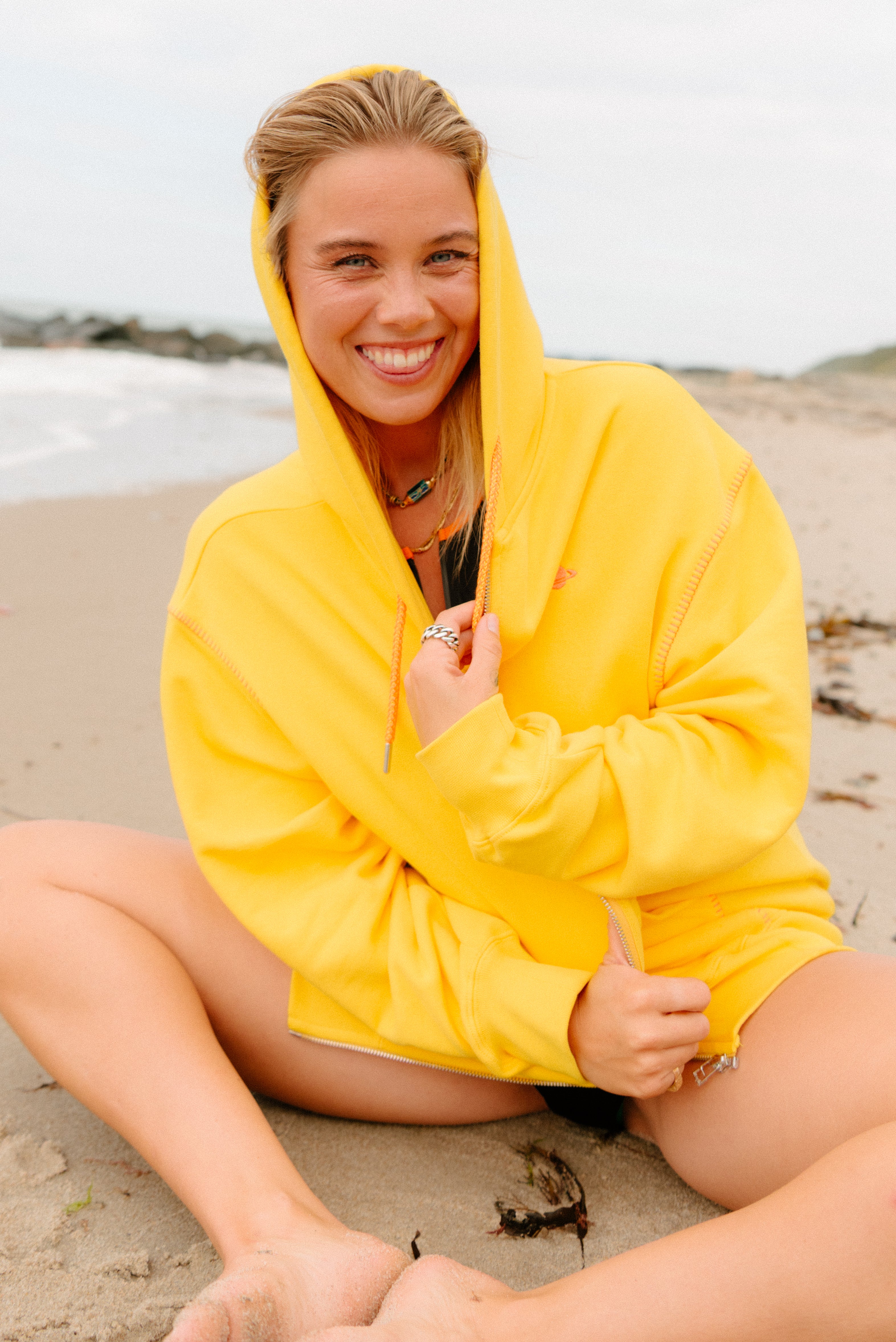 Zip into sunshine ☀️ A laid-back layer in vibrant yellow with orange stitching, robe-style drawstrings & a planet embroidery on the chest. Soft, cozy & perfect for layering—this hoodie goes where you go, from morning errands to breezy outdoor adventures! 🌳🏔️